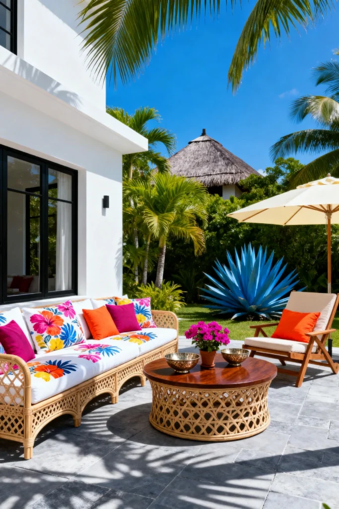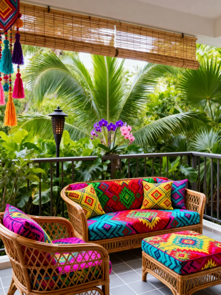 Wow, this balcony is like a little paradise! The vibrant colors and the lush greenery are just amazing. I’m totally drawn to the patterned cushions on the rattan sofa and chairs. The mixture of bright pinks, blues, yellows, and oranges is so energetic and fun. And those colorful tassels hanging above? They add such a whimsical touch. The palm trees and tropical flowers in the background make you feel like you’re on vacation, and that lantern on the railing adds a nice bit of warmth. I can see myself just relaxing here, sipping on something tropical and enjoying the view. The bamboo blinds provide a nice bit of shade and privacy. This is definitely the kind of place I’d love to escape to.