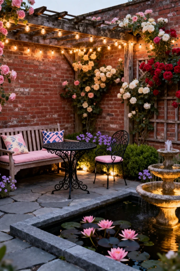 This garden is like something out of a fairytale. The red brick walls are covered in roses, and that trellis with the string lights is so magical. I love the little patio area with the bench and the iron table. The pink cushions are a lovely touch, and that multi-tiered fountain is just beautiful. I can imagine sitting here on a warm evening, surrounded by the scent of roses and the sound of trickling water. It’s so peaceful and romantic. The little purple flowers in the pots add another layer of color, and the water lilies in the pond are just gorgeous. This is definitely a place for quiet contemplation or a romantic dinner. It’s a garden retreat I could easily get lost in.
