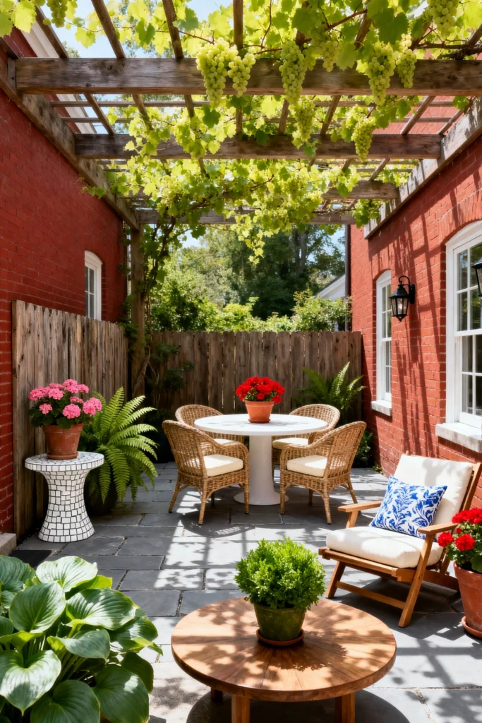 How charming is this brick patio? I love the red brick walls and the slate tiles, they give it such a classic, timeless feel. The wooden trellis covered in grapevines is just beautiful, and it provides a lovely bit of shade. The white bistro set with the rattan chairs is perfect for a small outdoor dining area, and that red geranium in the pot adds a vibrant pop of color. The hostas and ferns are so lush and green, and that mosaic table is such a unique touch. I can imagine having a delicious meal here, surrounded by the beauty of nature. It’s such a cozy and inviting space. This is definitely giving me some ideas for my own little patio, it’s a perfect example of how to make a small outdoor space feel special.