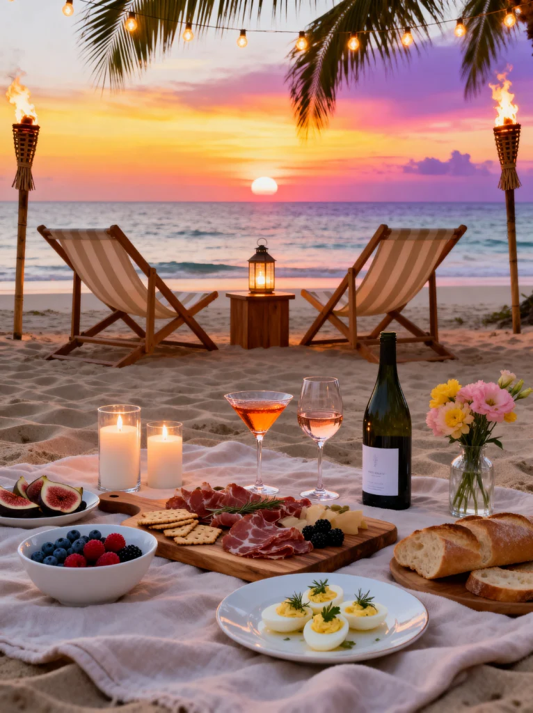 This beach picnic is just perfection. The sunset is stunning, and that spread of food is just mouthwatering. I can practically taste the prosciutto and cheese. The fresh berries, sliced figs, and deviled eggs all look so delicious, and that baguette is calling my name. The bottle of wine and the two glasses are just waiting to be poured. I love the candlelight and the string lights, they create such a warm and romantic atmosphere. And those striped beach chairs are perfect for watching the sunset. I can imagine sitting here, enjoying the sound of the waves and the beauty of the ocean, with good food and good company. This is definitely my kind of paradise.