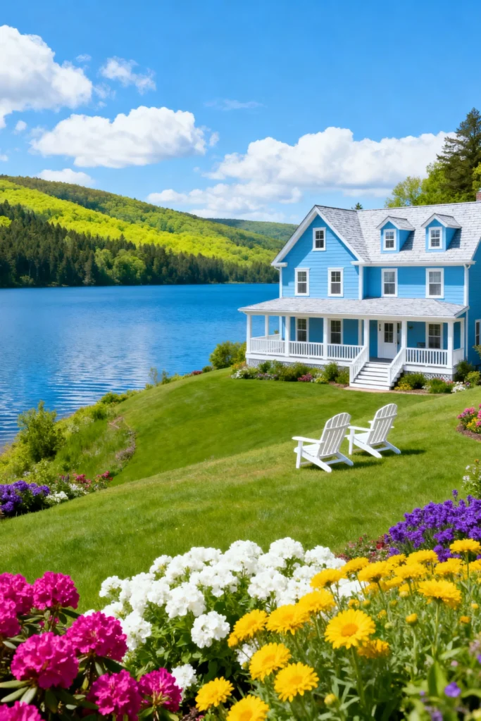 You have this incredibly charming blue house on a hill, with a stunning lake right in front of you. That view is simply to die for! I can just imagine sitting in those two Adirondack chairs with my coffee, watching the sunrise over the water. The way the lawn slopes down to the lake is so peaceful.If I were lucky enough to have this place, I’d definitely add some color to the porch and garden. , a mix of vibrant pink, white, and yellow flowers would really make the blue house pop. You could also hang some string lights across the porch for a cozy, evening vibe. Just picture it: firefly lighting up as you unwind after a long day. It’s the stuff of dreams!