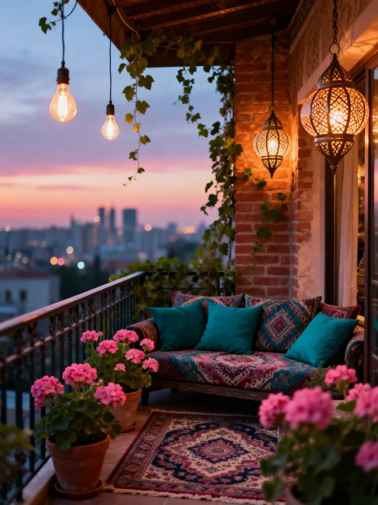 Notice how the lighting isn’t just one boring overhead bulb. You’ve got Edison bulbs hanging at different heights and those gorgeous intricate lanterns. It creates layers of light that feel cozy rather than clinical. Add some bright pink geraniums to pop against the sunset colors, and you’ve got a space that feels alive. It’s the perfect spot to watch the city lights flicker on while you decompress from the day. Just imagine the breeze hitting those vines while you’re curled up right there.
