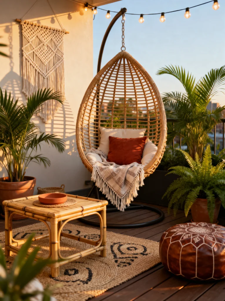 If you haven’t sat in an egg chair yet, are you even relaxing? This image is the perfect example of how to make a balcony feel like a high-end boutique hotel. That hanging wicker chair is a total game-changer because it adds height and a sense of playfulness without taking up much floor space. Plus, the movement of a swing chair is basically instant stress relief.