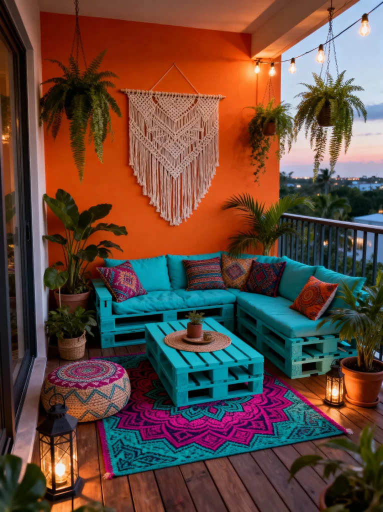 The details here are what really sell the look. That pink and teal mandala rug is a total showstopper and anchors the whole seating area. I’m also obsessed with the hanging ferns; they bring the “ceiling” down a bit to make the balcony feel like a cozy outdoor room rather than just a ledge. The macramé piece acts like a headboard for the sofa, making the space feel finished and intentional. This isn’t just a place to sit; it’s a place to host a mini-party or get inspired for your next creative project. It’s loud, proud, and absolutely beautiful.