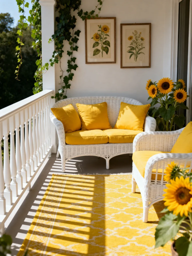 The use of sunflowers here is a masterclass in styling—they mirror the color of the cushions and the rug perfectly, creating a cohesive look that feels very “put together.” I also love the climbing ivy on the pillars; it softens the hard lines of the architecture and makes the space feel more private. The botanical prints on the wall are a sophisticated touch that makes the balcony feel like a true extension of the indoor living room. It’s the kind of place where you’d want to spend a Sunday morning with a croissant and the newspaper. It’s simple, elegant, and radiates positivity.