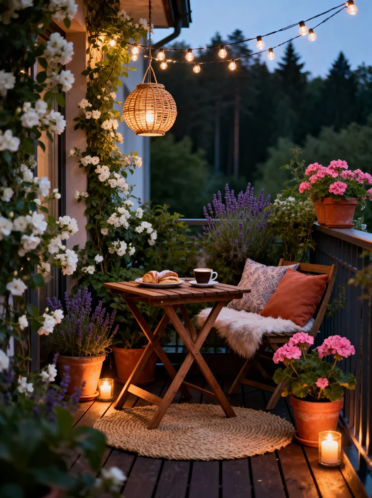 The setup is quite simple—just a folding wooden bistro set—but it’s the accessories that elevate it. The faux fur throw on the chair, the woven rug, and the soft pink geraniums make it feel so lived-in and cozy. But the real MVP here is the lighting. Between the string lights, the wicker pendant, and the floor candles, the ambiance is ten out of ten. It’s the perfect setting for a late-night coffee and a pastry while the stars come out. It’s intimate, lush, and incredibly dreamy.