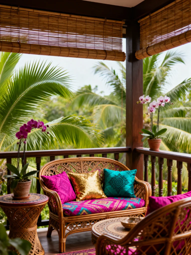 If you want your balcony to feel like a high-end jungle resort, look no further. This space uses dark wood and bamboo blinds to create a very sophisticated, “Old World” tropical vibe. The bamboo blinds are a genius addition because they provide shade and privacy while still letting a bit of light filter through in that beautiful, dappled way.