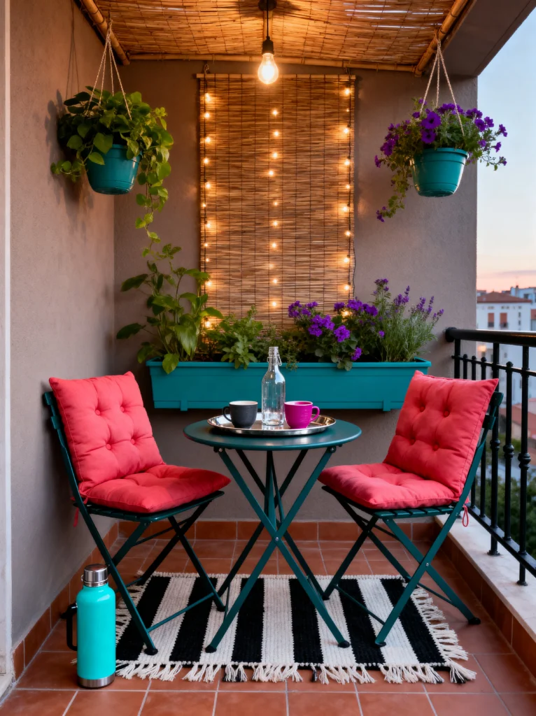 Don’t let a narrow balcony stop you! This look is proof that even the smallest “shoebox” space can be full of personality. The secret here is color blocking. Look at those punchy coral-pink cushions against the teal furniture—it’s bold, it’s fun, and it instantly wakes up the space. The black and white striped rug is a genius move, too; it adds a bit of sophisticated structure so the colors don’t feel too chaotic.