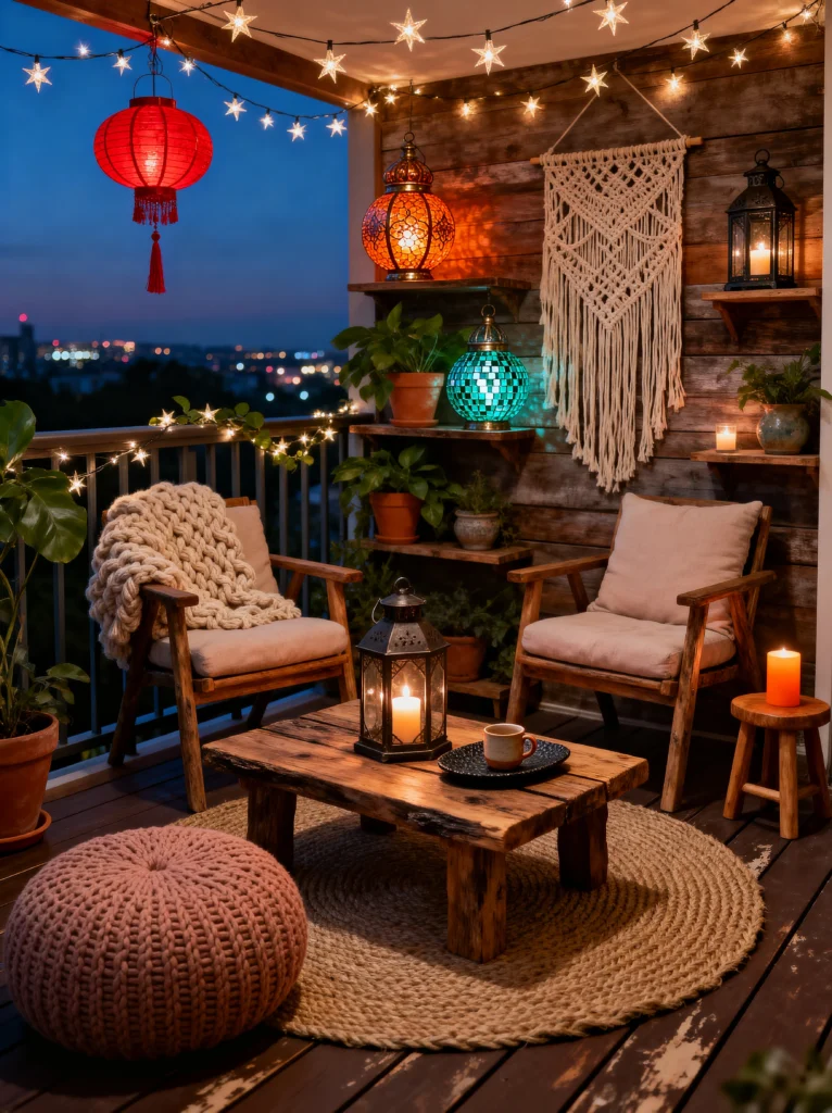 The lighting here is top-tier. You’ve got star-shaped string lights, a red paper lantern, and even a turquoise mosaic lamp. It shouldn’t work together, but it totally does because it leans into that eclectic, traveled look. Throw a chunky knit blanket over a wooden chair, light a few candles, and you’re ready for a deep conversation that lasts until 3:00 AM. It’s the kind of space that feels lived-in and loved, perfect for anyone who wants their home to feel like a cozy sanctuary.