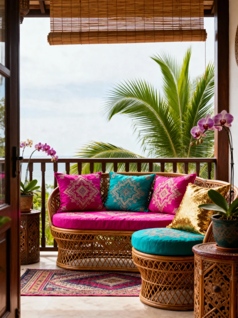 Can we talk about those colors for a second? This balcony feels like a direct flight to a tropical resort. If you’re lucky enough to have a view of some greenery—or even better, a palm tree—play into it! The wicker furniture is a classic choice for outdoor spaces because it’s breathable and light, but the bright magenta and turquoise cushions give it a modern, high-energy twist.