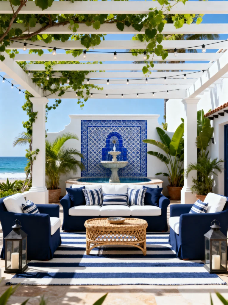 If your aesthetic is “luxury beach club,” this is the one for you. This setup is all about crisp whites and deep navy blues—the ultimate nautical pairing. The white pergola overhead with the grapevines is absolutely stunning; it provides dappled shade during the day and a place to hang lights for the evening. It’s very Mediterranean, almost like something you’d find on the coast of Greece or Italy.