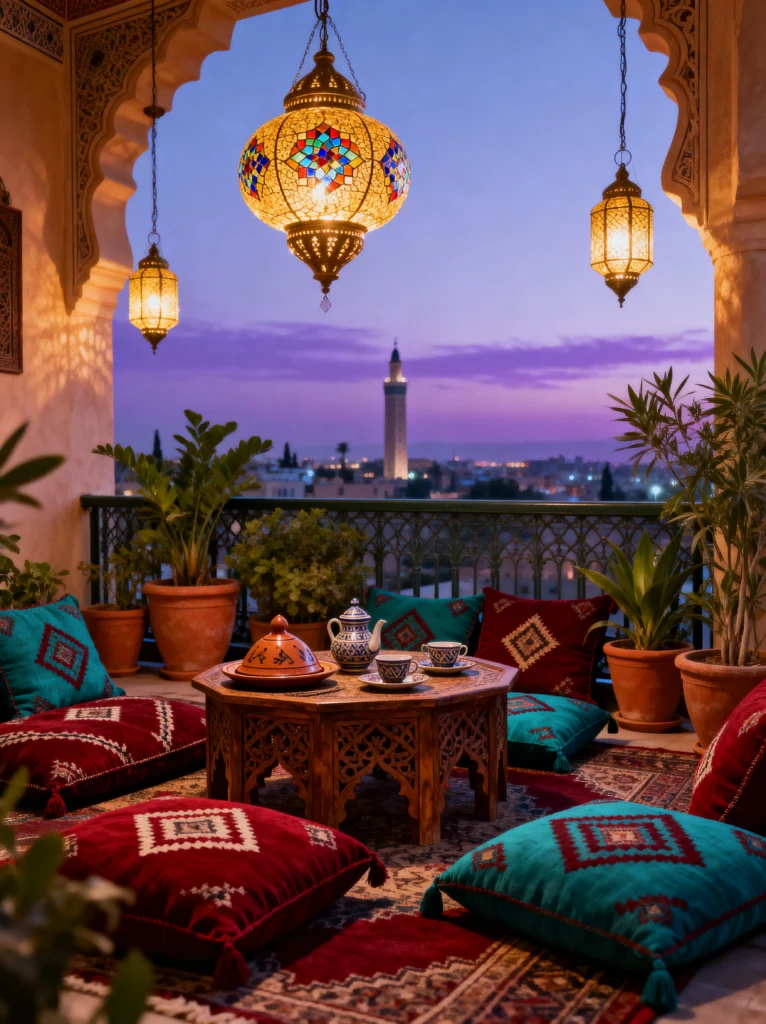 The archway framing the view of the minaret is architectural perfection, but you can recreate the feeling with a few tall potted plants and some draped fabric. Serving tea on a low, carved wooden table makes every afternoon feel like a ceremony. It’s a space designed for slow living—slow tea, slow talk, and watching the purple twilight take over the sky. It feels exotic and peaceful, a true escape from the hustle of everyday life.