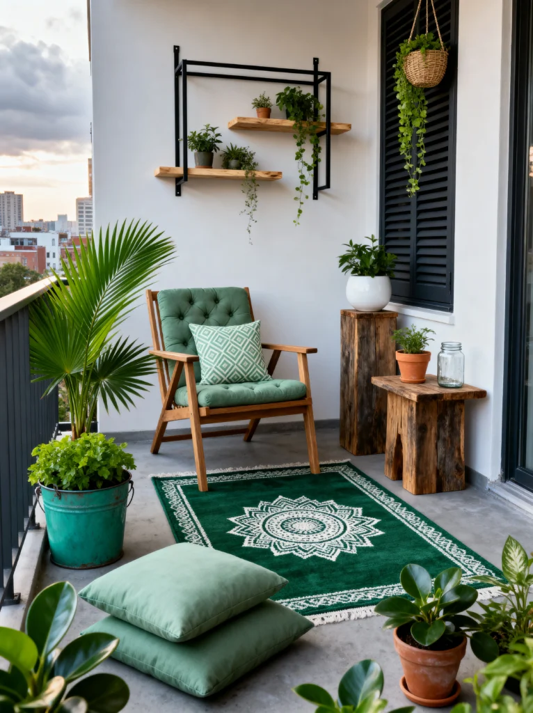 Sometimes, less really is more. This balcony is for the person who loves a clean, organized, and fresh environment. The emerald green color palette is so soothing—it mimics nature without being “wild.” That deep green rug with the mandala print is the perfect anchor for the space, and the tufted green chair looks like the ultimate spot for a midday nap.