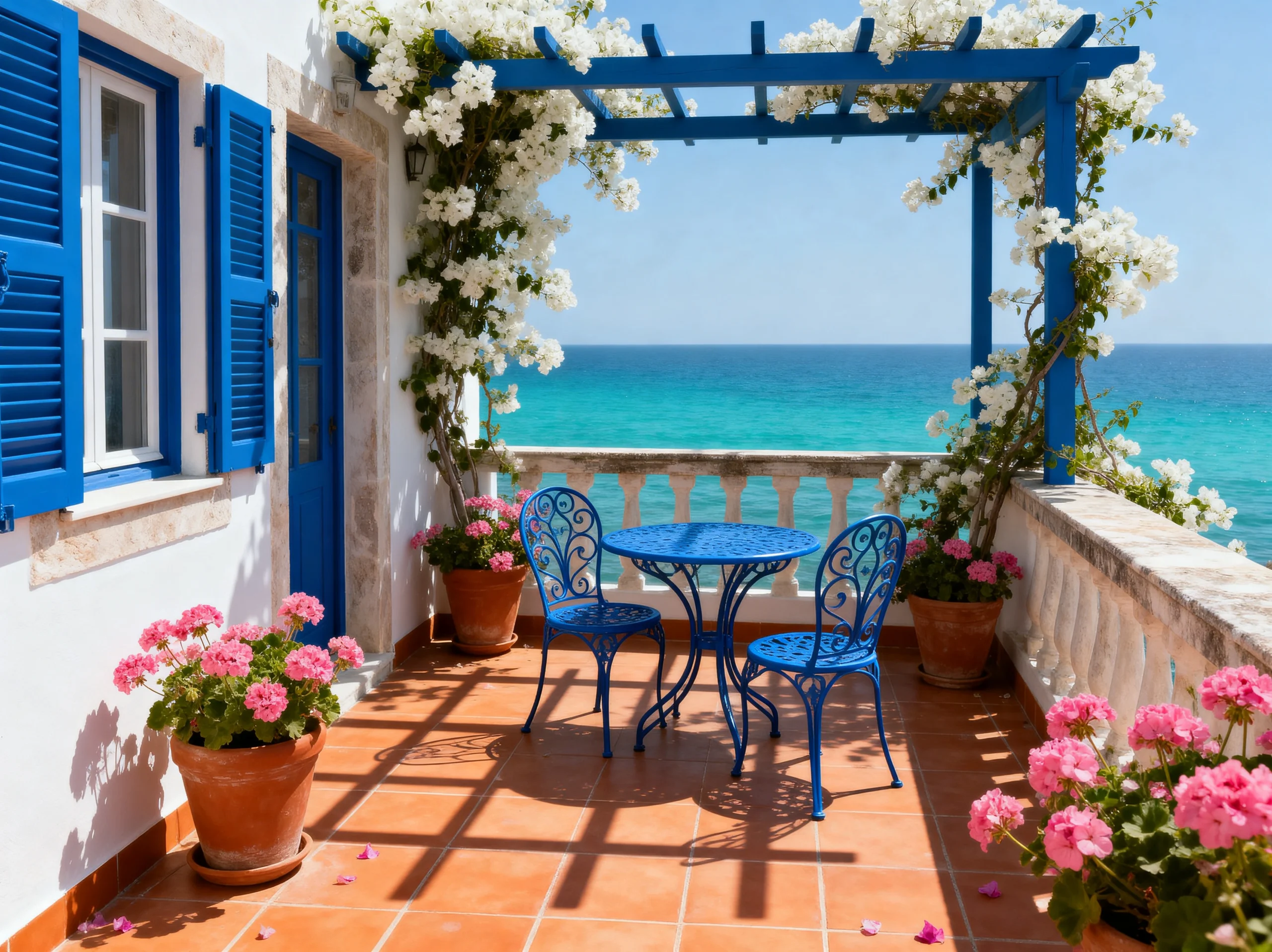 Is this a balcony or a portal to the Mediterranean? I am losing my mind over that view! But even if you don’t have the ocean at your doorstep, you can steal this aesthetic. The key here is the “Blue and White” palette mixed with terracotta. That mosaic bistro table is the star of the show—it’s practical for small spaces but adds so much character.