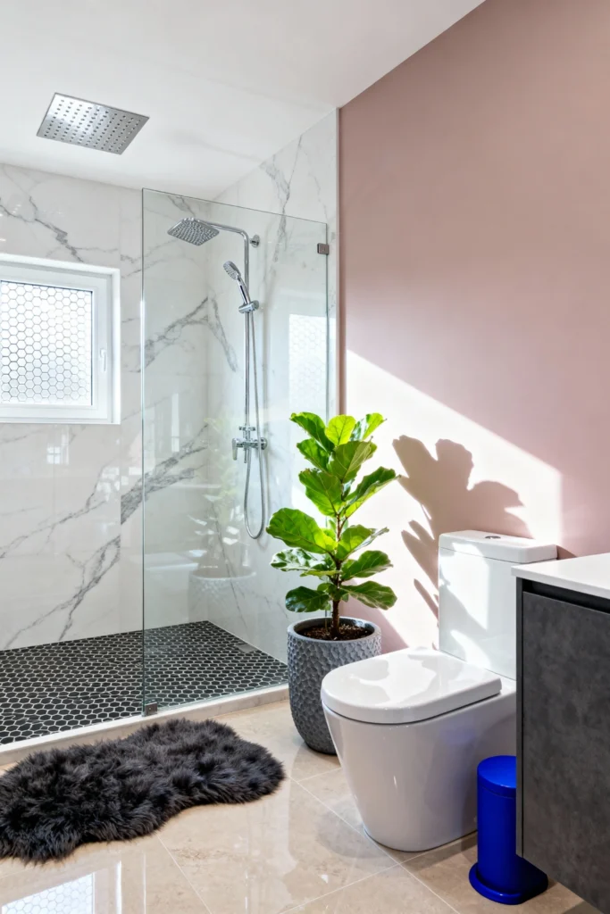 Let’s talk about that “fresh start” feeling. If you’re a fan of clean lines but don’t want your bathroom to feel like a cold doctor’s office, this is your blueprint. What I love about this space is how it balances that soft, dusty rose accent wall with the sharp, white marble of the shower. It’s sophisticated but still has a heartbeat.