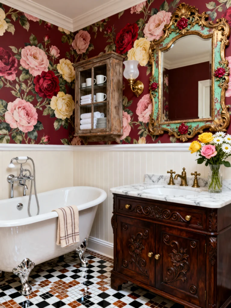 This bathroom is a total maximalist dream! It is not for the faint of heart, but I absolutely love the bold energy.The first thing you see is that incredible deep burgundy floral wallpaper. It’s covered in these massive pink and yellow roses, and it immediately sets a dramatic, slightly moody tone. And can we talk about that wild turquoise and gold gilded mirror? It’s like a piece of art! The vintage-style brass fixtures are the perfect choice, giving the whole space a feeling of history and old-world luxury. I even like how they incorporated a rustic wooden cabinet; it’s an unexpected element that adds a bit of warmth and texture. It’s quirky, it’s colorful, and it definitely has a personality all its own. Could you imagine starting your day here? It would be quite an experience!