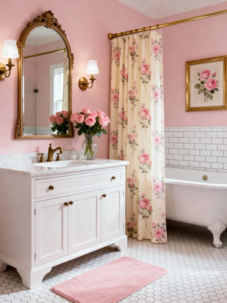 If the last one was a little too “much” for you, maybe this next bathroom will be more your speed. It’s giving me total cozy, cottagecore vibes, and I am here for it!The soft, rosy-pink walls are so calming, but they’re still really cheerful, too. The real star of this room is the vintage-style white wainscoting and the lovely floral shower curtain. It has these delicate pink roses that perfectly complement the paint color without feeling too overwhelming. The gold frame on the ornate mirror and the brass sconces are such elegant touches, and they really bring a sense of history and charm to the room. I especially love the way the sunlight streams in through the window, making the whole place feel bright and airy. It’s the kind of bathroom where you just want to light a candle, soak in that gorgeous clawfoot tub, and completely relax. Who wouldn’t want that?