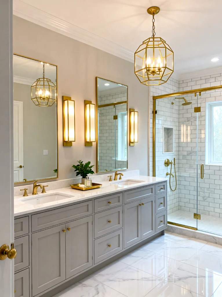 Okay, now let’s talk about something a bit more sophisticated and glamourous. This bathroom has some seriously sleek, high-end hotel vibes, and it’s perfect if you’re looking for a timeless, elegant aesthetic.The grey-panel vanity is such a great choice—it’s neutral but still adds a touch of color, and the marble countertop is classic and beautiful. But the gold. The gold is everywhere! Those geometric brass cage pendants are stunning, the mirrors have these simple, clean brass frames, and all the fixtures and shower hardware are gold too. It’s such a sophisticated combination, and it makes the whole room sparkle. I love the way the white subway tiles in the shower contrast with the clean grey walls. It’s a look that’s both polished and modern, but it won’t go out of style anytime soon. What do you think? Is this gold-accented glamour a winner?