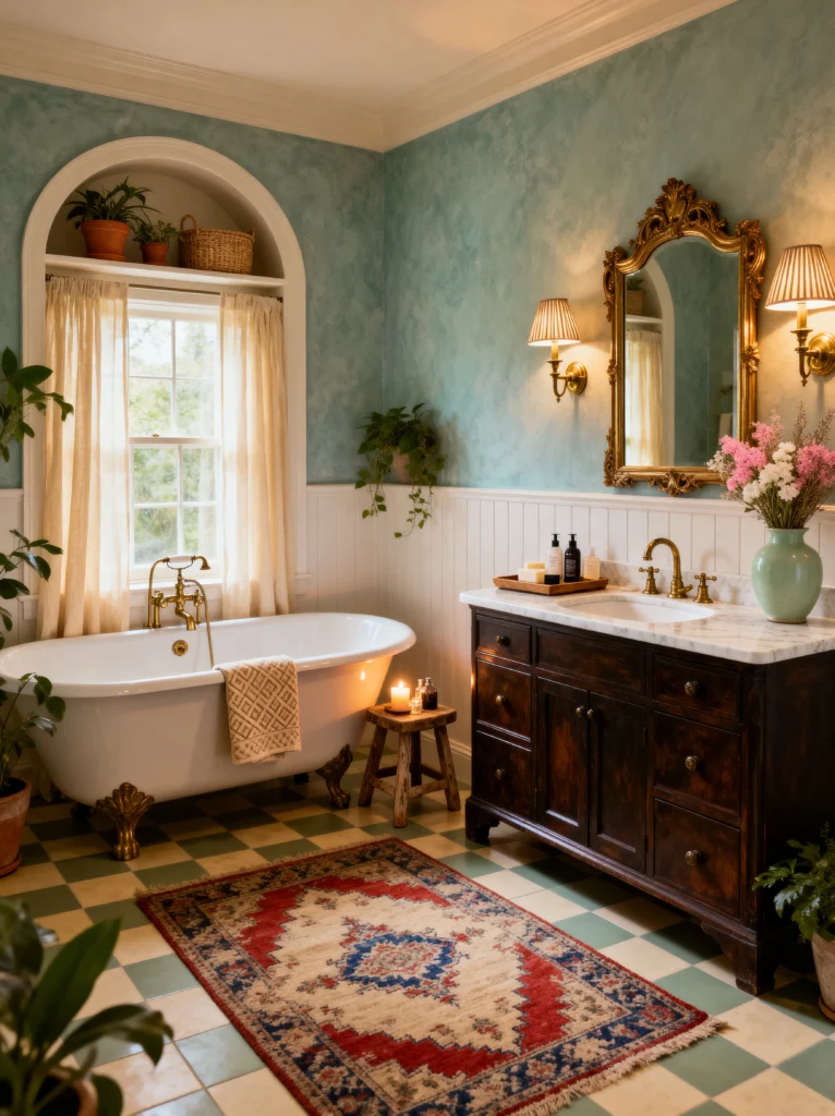 This next bathroom is like a breath of fresh air. It is so warm and welcoming, and it has this beautiful, curated feel that I just love.The first thing you notice is the textured, distressed teal paint on the walls. It gives the room so much character and a touch of that aged, Italian farmhouse aesthetic. And then, there’s that incredible, ornate gold-frame mirror! It’s such a beautiful focal point. But my favorite thing might be the details: the white beadboard wainscoting, the dark wood double vanity, and that gorgeous, vintage-style patterned floor rug. It makes the whole space feel so layered and loved. The arched window with the simple linen curtain is another lovely touch, letting in that soft natural light. This bathroom isn’t just about looks—it feels like a space that tells a story. What story do you think it tells?