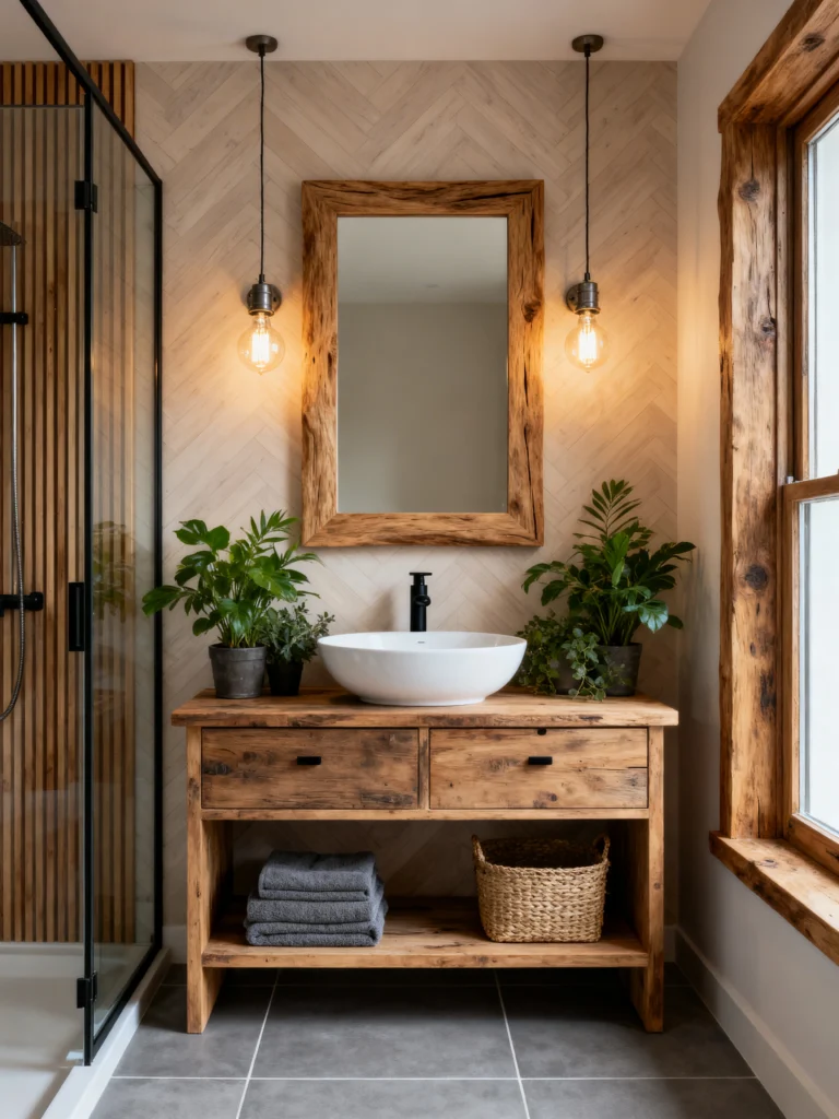 And finally, for all my natural material lovers, we have this cozy, rustic sanctuary. This bathroom is all about creating a feeling of calm and comfort, and it’s so inviting.I’m obsessed with that incredible wooden vanity—it’s so raw and tactile, and you can see all the natural grain. The square mirror is made from the same weathered wood, giving the whole area a grounded, handcrafted feel. I also love the subtle texture of the light-colored herringbone-patterned wall tile. But my favorite part is the greenery! The space is just full of these lush, beautiful plants. Potted on the vanity, hanging from a shelf… it adds so much life and warmth to the room. The dark floor tiles and black fixtures give it a slightly modern edge, but the overall feeling is one of peace and a deep connection to nature. Is this rustic vibe calling your name?