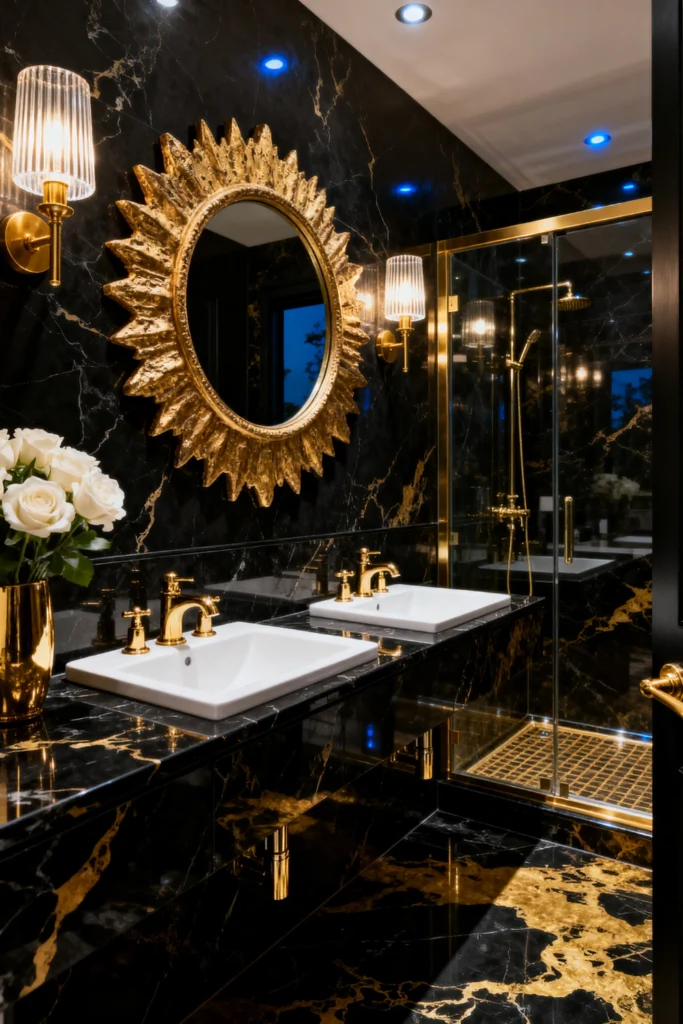 Okay, if you want to feel like royalty every time you brush your teeth, this is the vibe. This bathroom is unapologetically “extra,” and I am here for it. The black marble with heavy gold veining creates such a dramatic backdrop, and when you pair it with those twin gold faucets, it’s pure luxury.