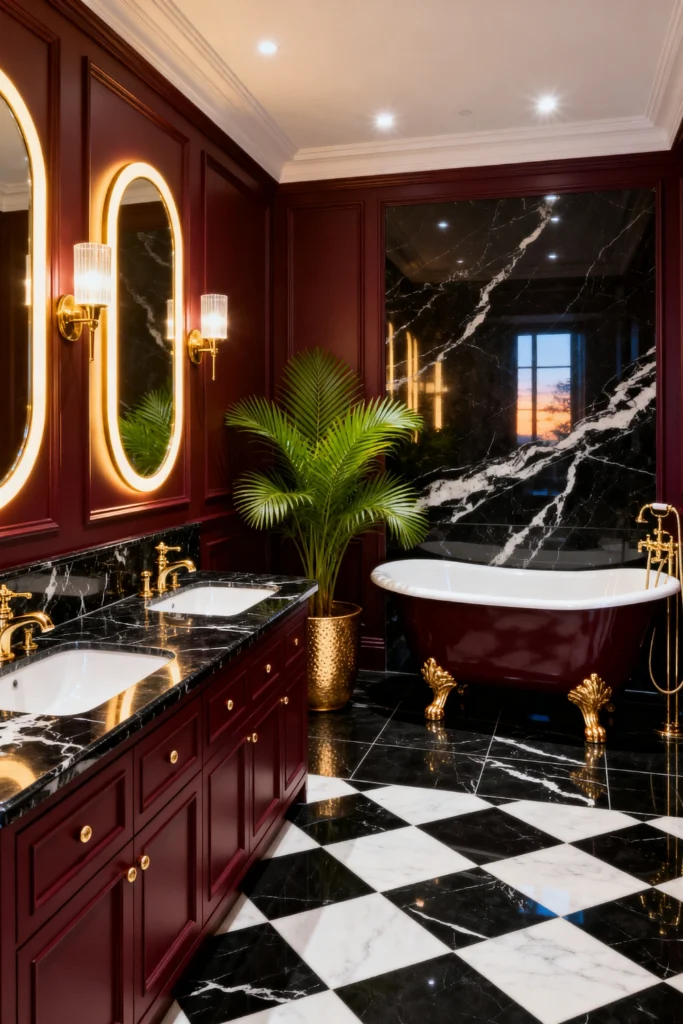 That burgundy clawfoot tub is an absolute dream. Imagine soaking in there with a book! The gold hardware adds that necessary sparkle, and those oval backlit mirrors are a genius way to get perfect lighting while looking incredibly sleek. It’s a very bold choice to go with red walls, but because the floor is so graphic and the marble is so clean, it doesn’t feel overwhelming. It feels intentional, powerful, and very, very stylish.
