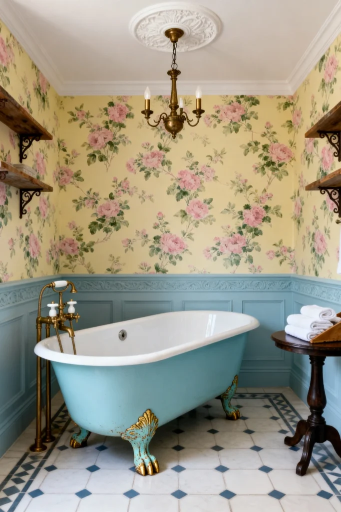 The light blue clawfoot tub with the gold “eagle” feet is such a playful touch. It’s those little details—like the ornate ceiling medallion and the simple wooden shelves—that make this space feel collected over time rather than just “bought.” It’s a great reminder that you don’t always need expensive stone to make a statement; sometimes a beautiful roll of wallpaper and a can of pastel paint can completely transform the energy of a room.