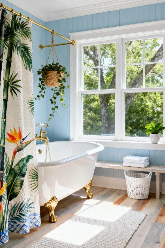 Close your eyes and you can almost smell the salt air. This bathroom is the definition of “airy.” The pale blue shiplap walls give it a relaxed, coastal cottage feel that makes you want to slow down. I’m obsessed with the shower curtain—that bold tropical print with the “Bird of Paradise” flower adds a huge splash of color without being too much.