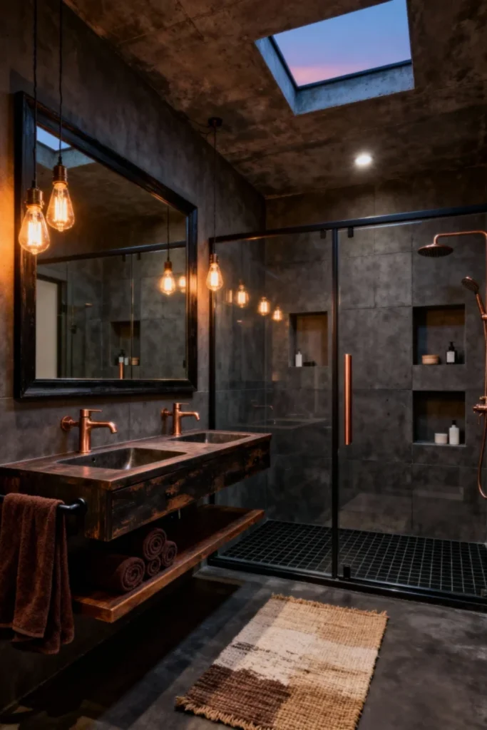 Those Edison bulb pendant lights are a classic industrial staple, and they look amazing reflecting in that large, black-framed mirror. I also love the pop of copper/rose gold in the faucets and showerhead—it adds a “warm” metal to an otherwise “cold” concrete space, which is a pro move for keeping the room from feeling too sterile. The skylight is the cherry on top, bringing in a column of natural light that highlights all those gritty, beautiful textures.