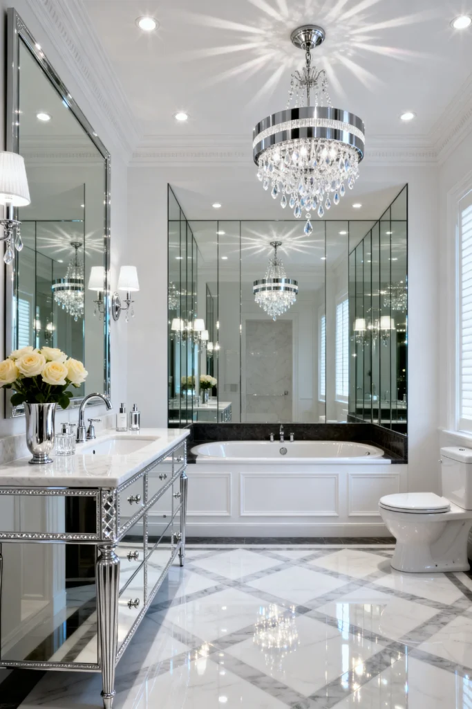 The crystal chandelier is the obvious star here, casting beautiful light patterns across the white marble floors. Even the vanity is mirrored! It’s a very high-maintenance look, but man, does it pay off. It’s crisp, it’s clean, and it’s incredibly sophisticated. It feels like the kind of place where you’d spend two hours getting ready for a gala. If you want to make a small bathroom feel like a palace, mirrors are your absolute best friend.