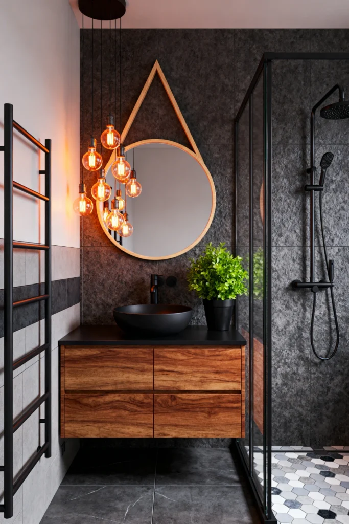 This design is all about contrast, and it’s absolutely gorgeous.First of all, those dark charcoal grey stone tiles are stunning, but the star of the show has to be that warm, rich wooden vanity. It totally pops against the dark background, giving the whole room a sophisticated yet grounded feel. The hanging pendant light is genius, too—those exposed Edison-style bulbs cast a really beautiful, warm glow that ties everything together. I also love the way they paired the modern hex tiles on the floor with the sleek, frameless glass shower. This space is proof that you can have a very cool, masculine design that still feels inviting and chic. What do you think? Is this sleek style for you?