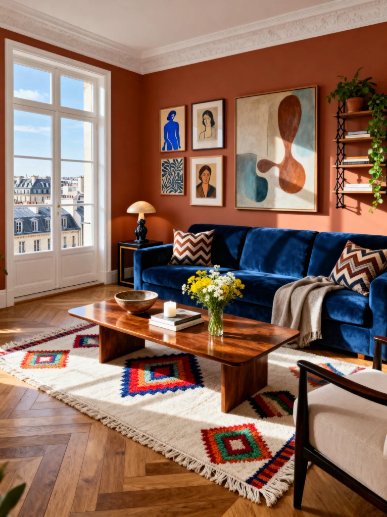 This living room is a masterclass in using high-contrast colors without making the space feel like a box of crayons. That deep terracotta wall is such a vibe—it’s earthy, sophisticated, and makes that royal blue velvet sofa absolutely pop. It’s a risky color combo on paper, but in person? It’s pure magic.