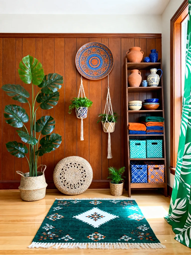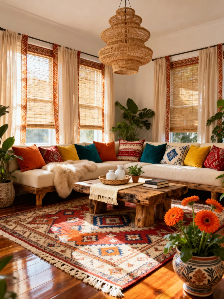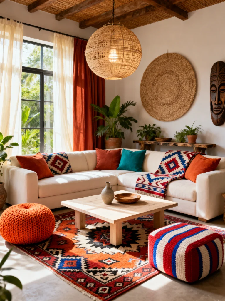 This living room feels like a permanent vacation. If you love global patterns and sun-drenched spaces, this is your blueprint. The massive wicker pendant light is the first thing you notice—it’s a huge “wow” factor that adds a ton of texture without feeling heavy.