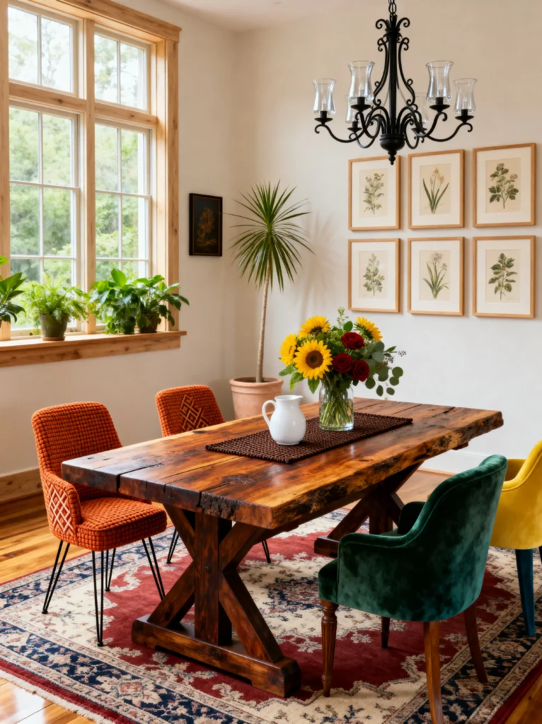 The botanical prints on the wall are a genius move. They bring in a vintage, academic vibe that balances out the “chunkiness” of the table. Plus, the black wrought-iron chandelier adds just enough “weight” up top to anchor the space. This is the kind of room where Sunday brunch turns into a four-hour conversation. It’s sophisticated enough for a dinner party but cozy enough that you wouldn’t be afraid to spill a little wine on the rug. It’s all about that lived-in luxury.