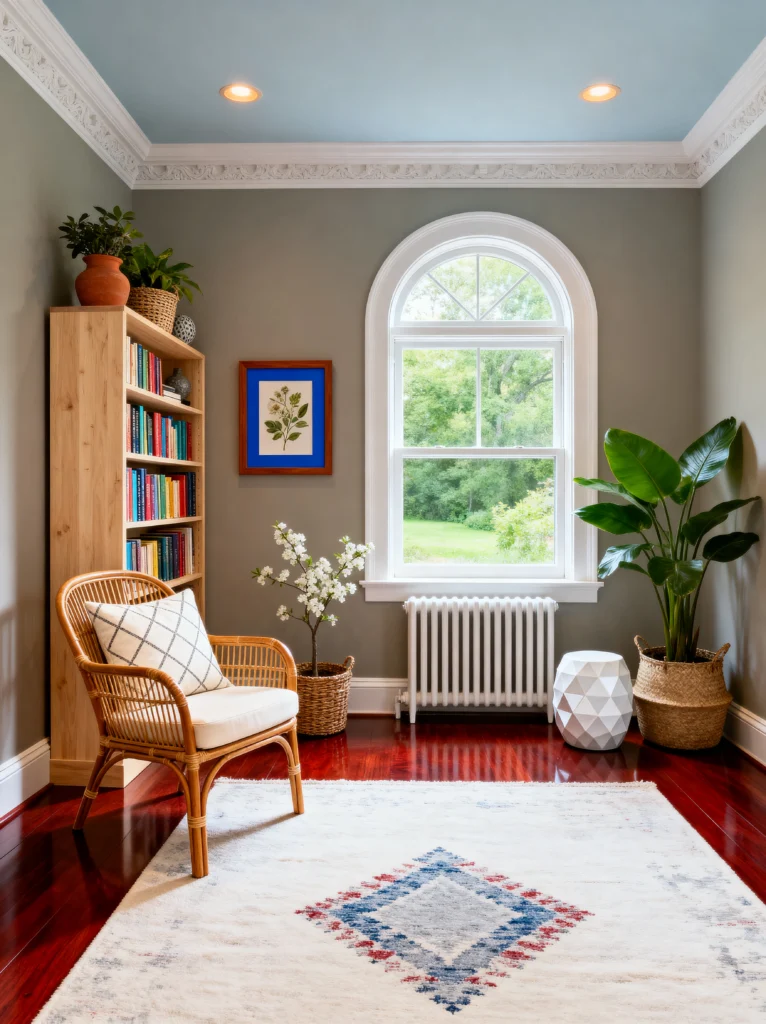 The rattan chair is a classic boho staple, but adding a crisp, geometric pillow keeps it feeling modern rather than “70s basement.” Notice the radiator under the window? Most people try to hide them, but here, it’s just part of the architecture, topped with a beautiful arched window that lets the greenery outside act as live wallpaper. It’s a small space, but between the tall bookshelf and the oversized floor plant, it feels grand. It’s the perfect spot to put your phone on “Do Not Disturb” and finally finish that book you started months ago.