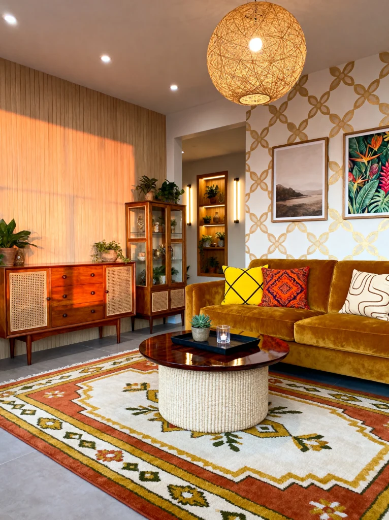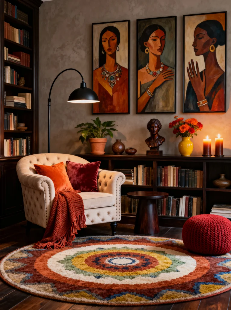 The lighting here is what creates the magic. You’ve got a sleek black floor lamp for task lighting over the tufted armchair, but you also have candlelight and warm shelf lighting. It creates layers of glow that make the velvet pillows and the chunky red pouf look so inviting. And look at that rug! It’s like a sunburst on the floor. This room isn’t just a place to sit; it’s an experience. It’s moody, artistic, and deeply personal. It tells anyone who walks in that the person living here has a story to tell.