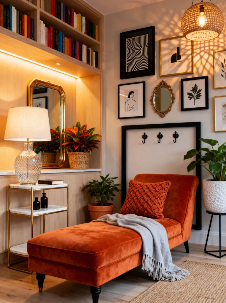 Let’s talk about the ultimate indulgence: the chaise longue. This burnt orange velvet beauty is the definition of “treat yourself.” Placing it in front of a built-in bookshelf makes this the most luxurious reading spot imaginable.