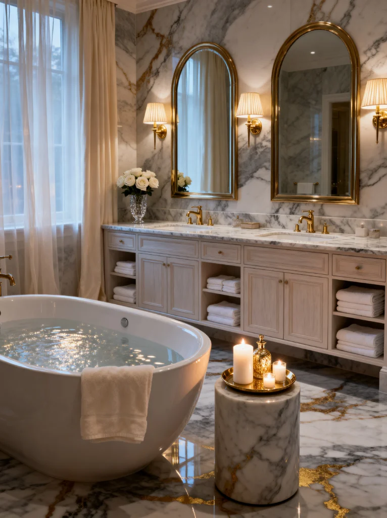 If “main character energy” was a bathroom, this would be it. Honestly, I’m not sure if I’d ever actually leave this tub. The first thing that hits you is that incredible marble. It’s not just plain white; it’s got those deep, dramatic veins and even hints of gold that make the whole floor look like a piece of art. It’s unapologetically luxurious.