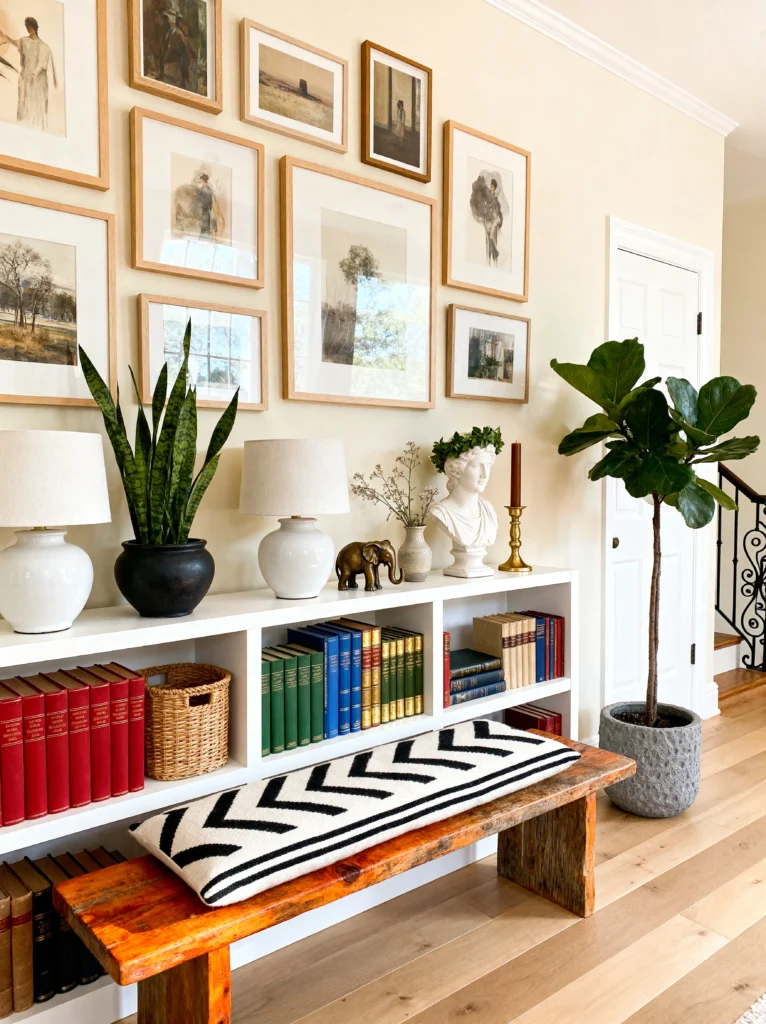 But the real star for me is that rustic wooden bench with the chevron cushion. It adds a bit of “rough around the edges” charm to an otherwise very polished setup. It’s practical, too—a place to sit while you struggle with your boots. Toss in a fiddle leaf fig and a snake plant, and you’ve brought the whole thing to life. It’s a perfect mix of classical elements (like that bust) and modern styling. This isn’t just a hallway you walk through; it’s a space that makes you want to linger and look at every little treasure on the shelf.