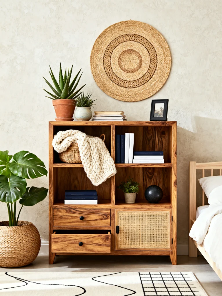 There is something so incredibly grounding about natural wood and woven textures. This little corner is proof that you don’t need a ton of color to make a statement. The grain on that wooden cabinet is so beautiful—it’s got so much movement and warmth. And that rattan door? It’s the perfect touch of 70s-meets-modern style.