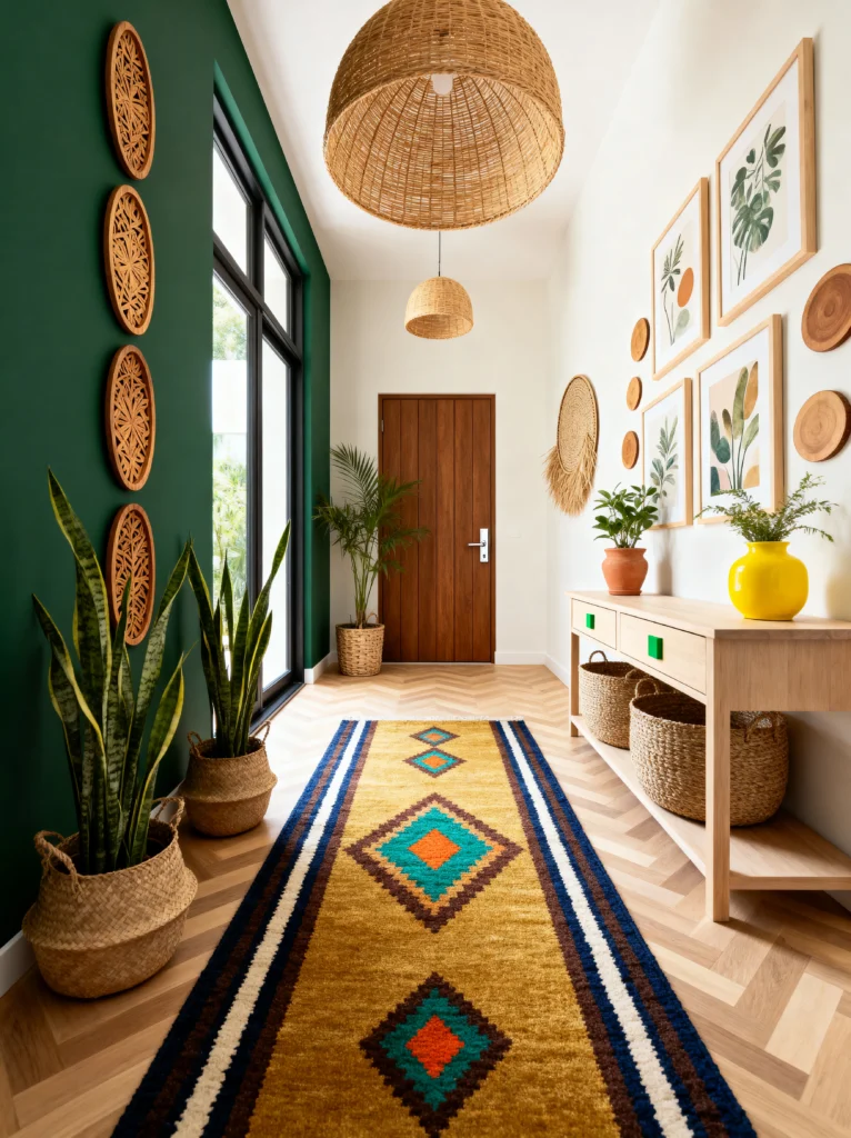 Then you have that yellow-mustard runner rug with the teal accents. It draws your eye right down the hall toward that beautiful wood door. It’s a bold choice, but because the rest of the furniture—like the light wood console table—is neutral, it doesn’t feel overwhelming. It feels like a tropical modern villa. It’s bright, it’s leafy, and it’s full of energy. Every time you walk through this hall, you’d probably feel a little bit like you’re on vacation.