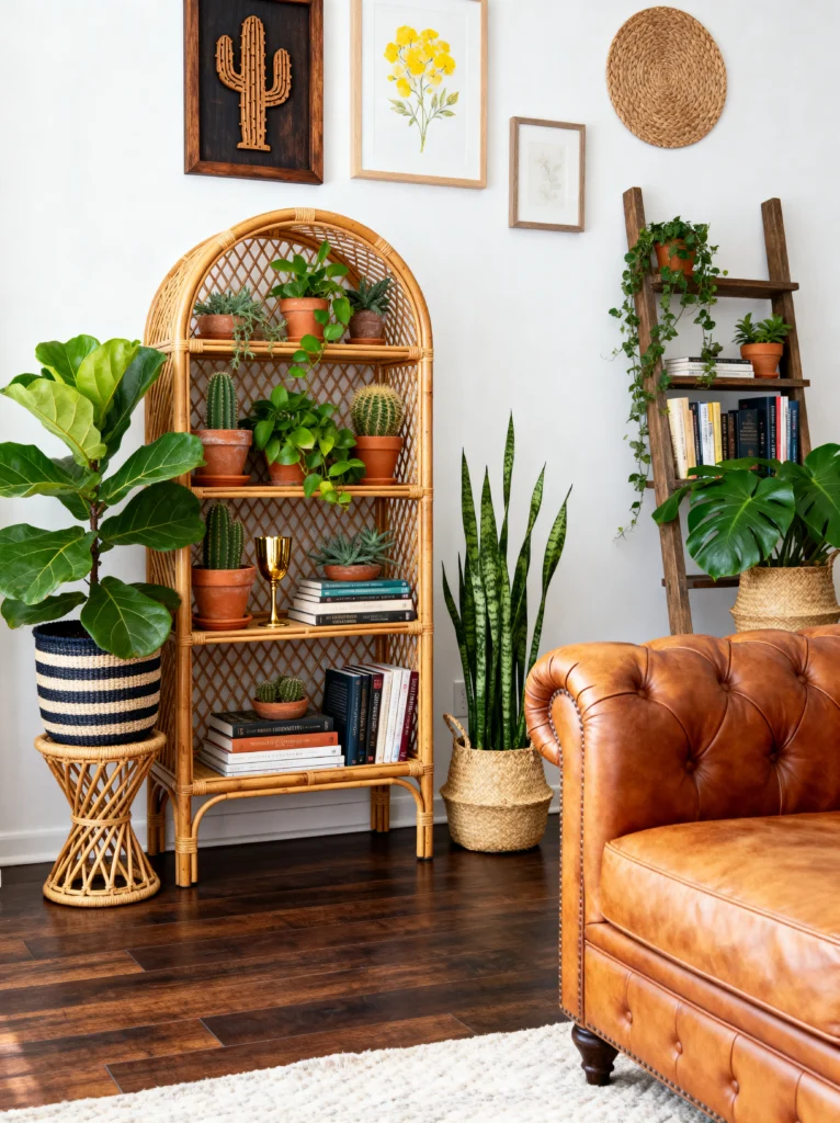 Can we just take a second to appreciate the arched rattan bookshelf? It is absolutely stunning. It’s got that vintage, bohemian charm that’s so trendy right now, but it feels timeless because it’s filled with such a lush collection of plants. It’s basically a literal “plant stand” taken to the next level.