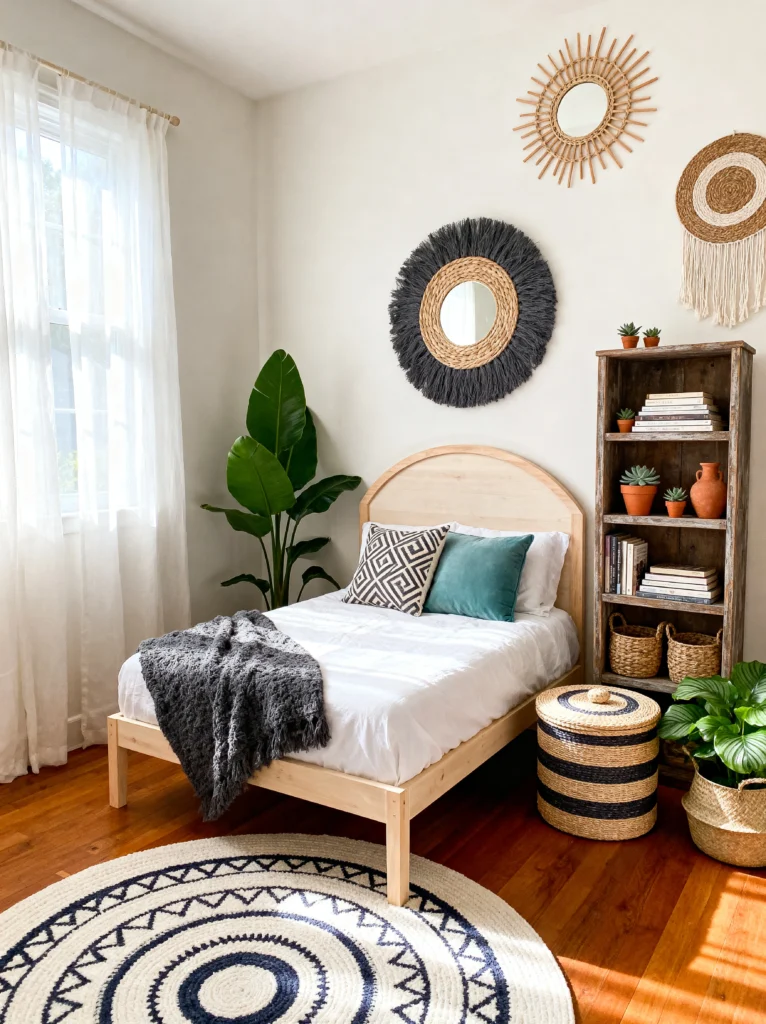 The wall decor is so clever here. Instead of one big painting, they’ve used a variety of woven mirrors and wall hangings. It adds texture and interest without the “weight” of a heavy frame. The sunburst mirror and the fringed circular piece almost look like tribal art, giving the room a bit of a global, wanderlust feel.