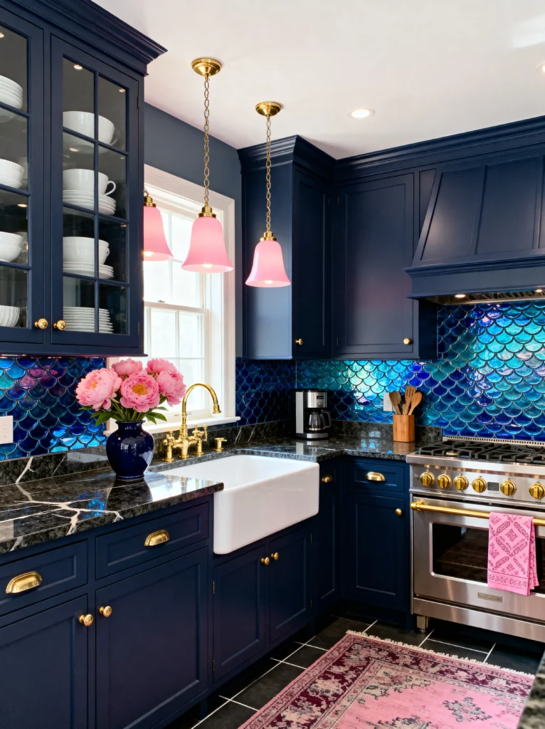 But the real magic? It’s all about that backsplash! Have you ever seen anything like it? It’s covered in these shimmering, iridescent blue-green fish scale tiles. They look like they were plucked straight from a mermaid’s tail, and they catch the light in the most amazing way. It just goes to show that you can totally take design risks, and when you do, the results can be stunning! The unexpected pop of pink from the pendant lights and that gorgeous bouquet of peonies ties everything together with a touch of soft, feminine grace. This is a kitchen with serious personality, and I am here for it!