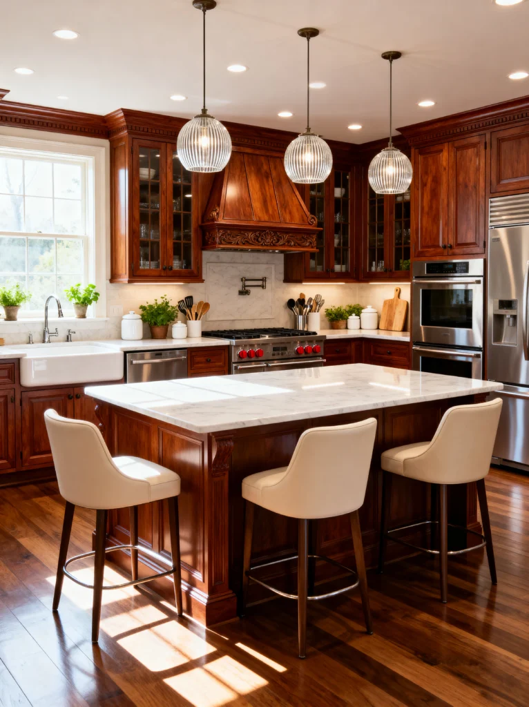 This is the ultimate “forever home” kitchen. It’s got that rich, cherry-wood cabinetry that feels timeless and sturdy. If you love a kitchen that feels warm and inviting the second you walk in, this traditional style is your best friend. The carved details on the range hood give it a custom, artisanal feel that you just don’t get with flat-pack furniture.