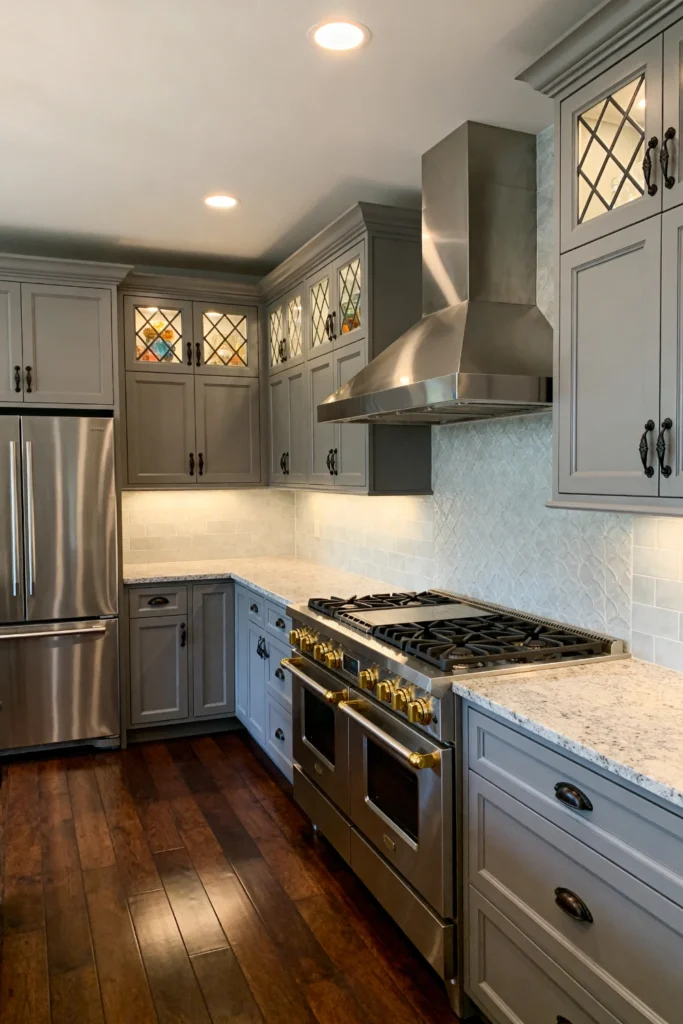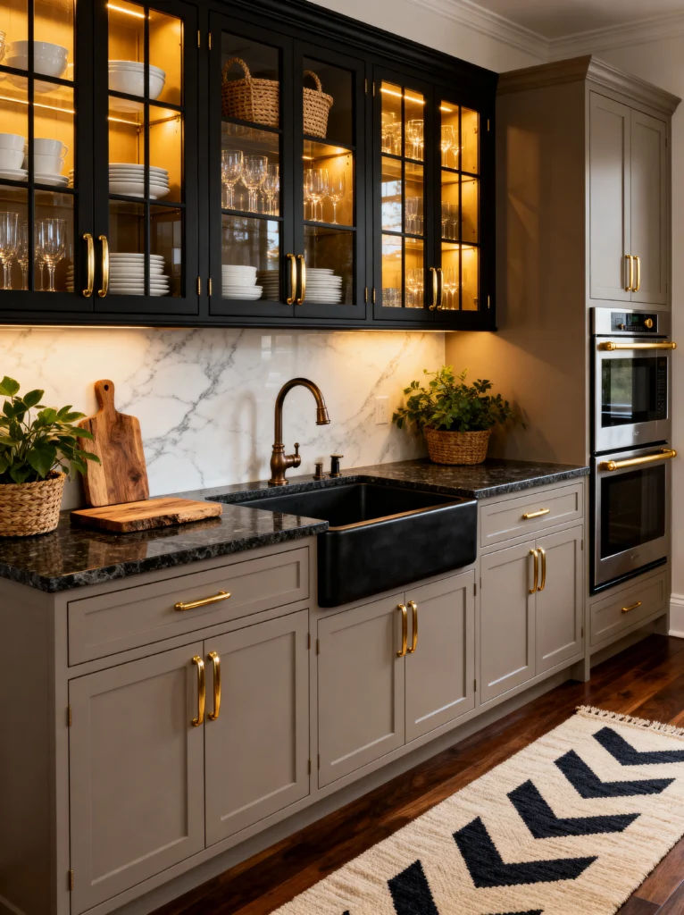 This kitchen is a masterclass in using “greige” and black to create a cozy, layered look. The taupe-colored lower cabinets feel very grounded and calming, while the black-framed glass uppers add a touch of drama. I love the interior lighting in those glass cabinets—it turns your everyday plates and glasses into a beautiful display. It’s like having a mini-gallery in your kitchen!