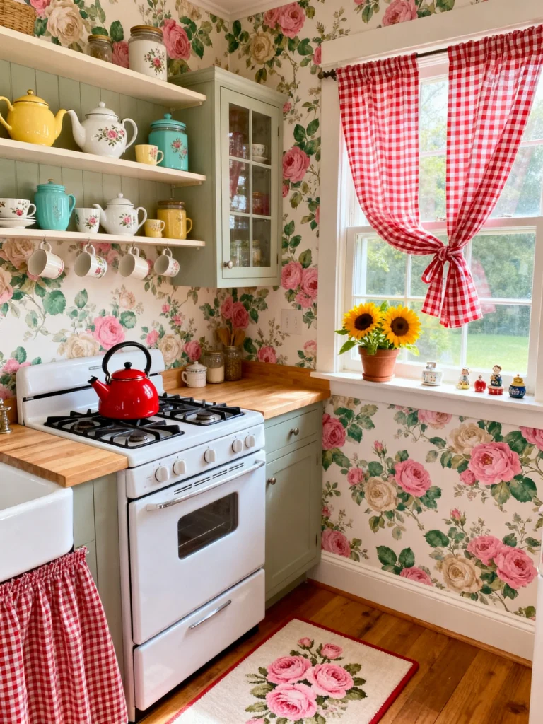 Instead of heavy upper cabinets, this space uses open shelving to show off a collection of colorful teapots and jars. It makes the kitchen feel lived-in and accessible. The sage green cabinets are the perfect “neutral” here—they pull the green from the wallpaper leaves without being overwhelming. The red and white gingham curtains add a playful, farmhouse pop of color that matches the bright red kettle on the stove. This isn’t a kitchen for someone who wants everything hidden away behind sleek doors; it’s a kitchen for someone who finds beauty in the “clutter” of daily life. It’s whimsical, sweet, and full of personality.