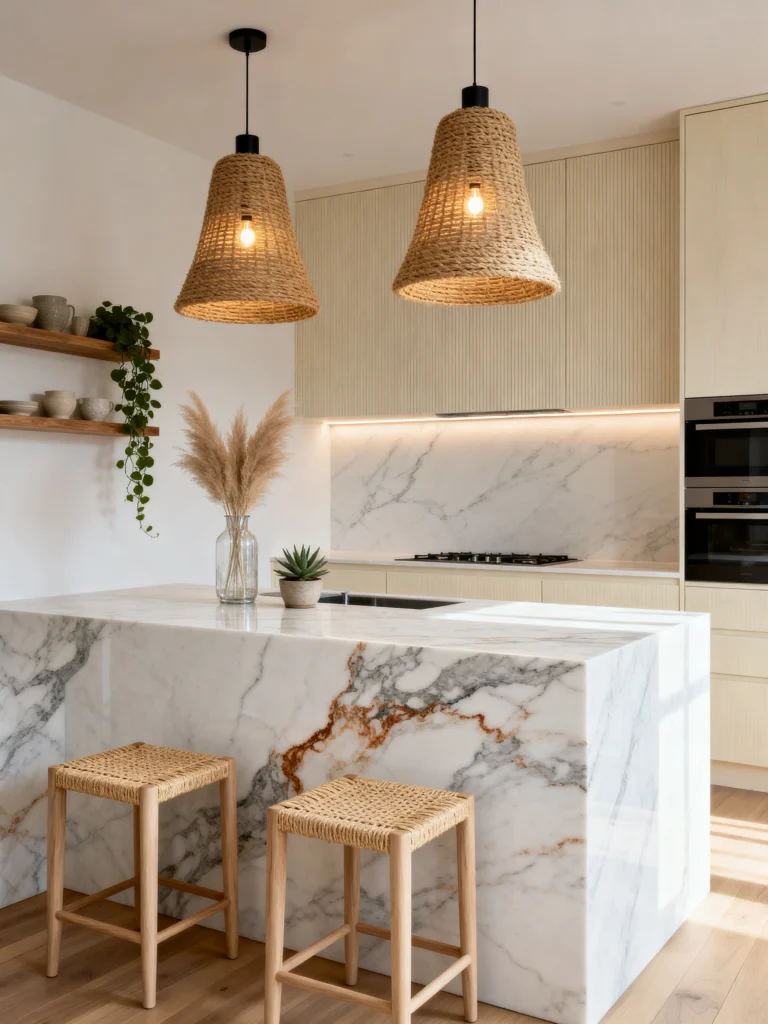 If your goal is to feel like you’re at a luxury spa while you’re making toast, look no further. This kitchen is all about texture and natural materials. The waterfall marble island is a total showstopper—look at how the veining continues right down to the floor! It’s a very high-end design trick that makes the island feel like a solid block of stone.