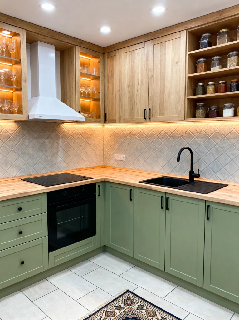 This kitchen feels like the perfect middle ground for someone who wants a bit of color but still wants their home to feel peaceful. Sage green is basically a neutral at this point; it’s so easy on the eyes and goes with almost everything. Pairing it with light wood countertops and upper cabinets keeps the whole room feeling very “Scandi-inspired” and bright.