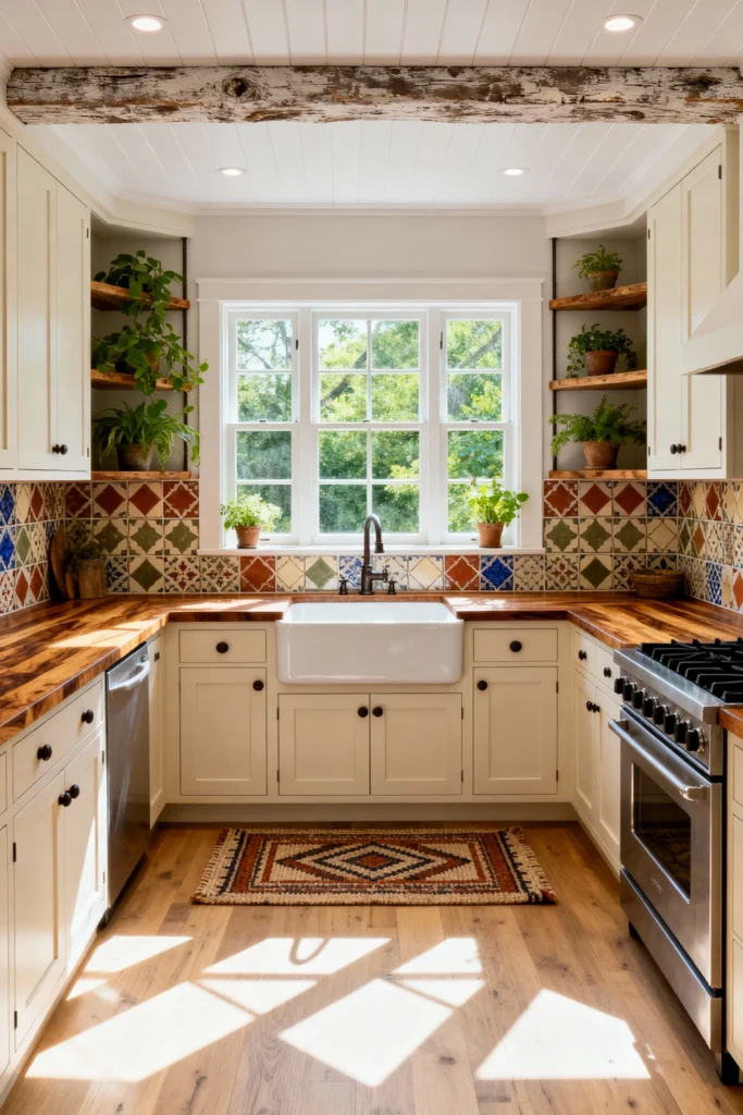 Ok, let’s talk about kitchens with a global soul! This space immediately transports me to a vibrant pueblo, with its incredible, richly-patterned tiles in cobalt blue, sunny yellow, emerald green, and deep red. Isn’t it just bursting with energy? It feels less like a sterile cooking zone and more like an artist’s studio where the medium is delicious, flavor-packed meals.